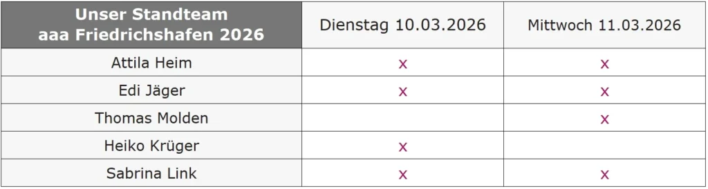 Unsere Kollegen aus dem projektvertrieb sind an beiden Tagen für Sie auf der Messe und helfen Ihnen gerne bei der Auslegung Ihrer Antriebslösung. Welchen Ansprechpartner Sie wann auf unserem Stand antreffen können sehen Sie hier:
