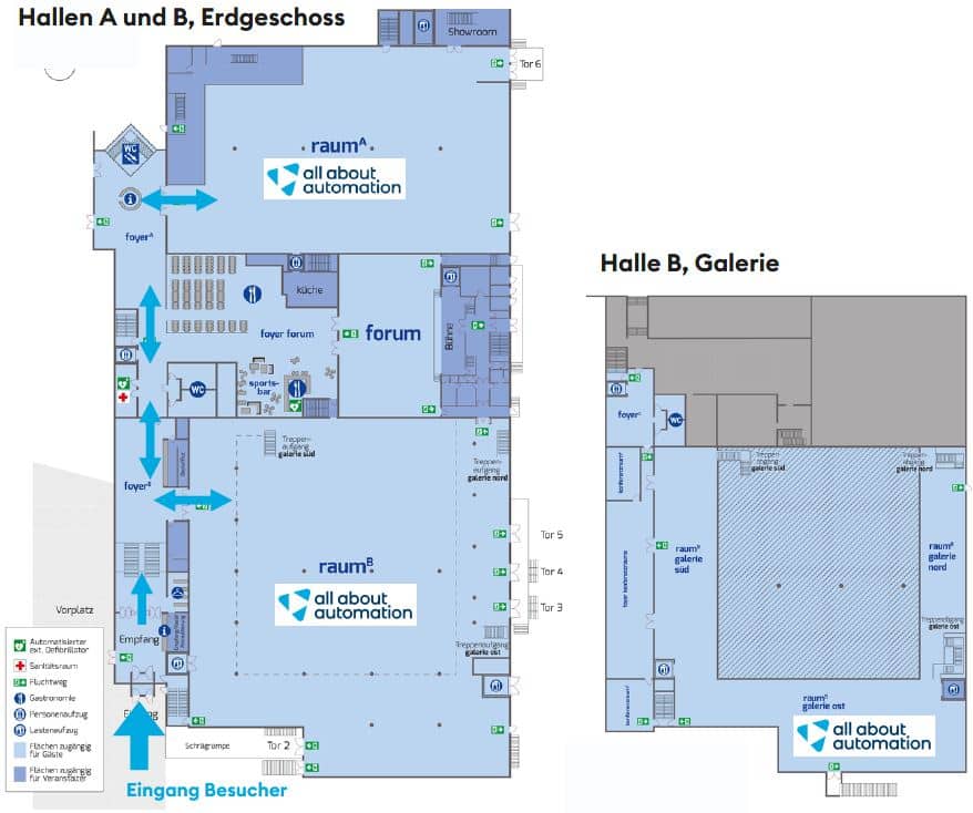 Die all about automation findet in der redblue Eventlocation in Heilbronn statt: Wannenäckerstraße 50, 74078 Heilbronn. Über den Eingang für Besucher gelangen Sie direkt über die erste Treppe in die Galerie über der Halle B und auf unseren Stand OG-150. Im nachstehenden Geländeplan sehen Sie, wie Sie am besten zu uns kommen. Alle Informationen zur Anreise finden Sie zudem auf der Webseite der all about automation Messe.